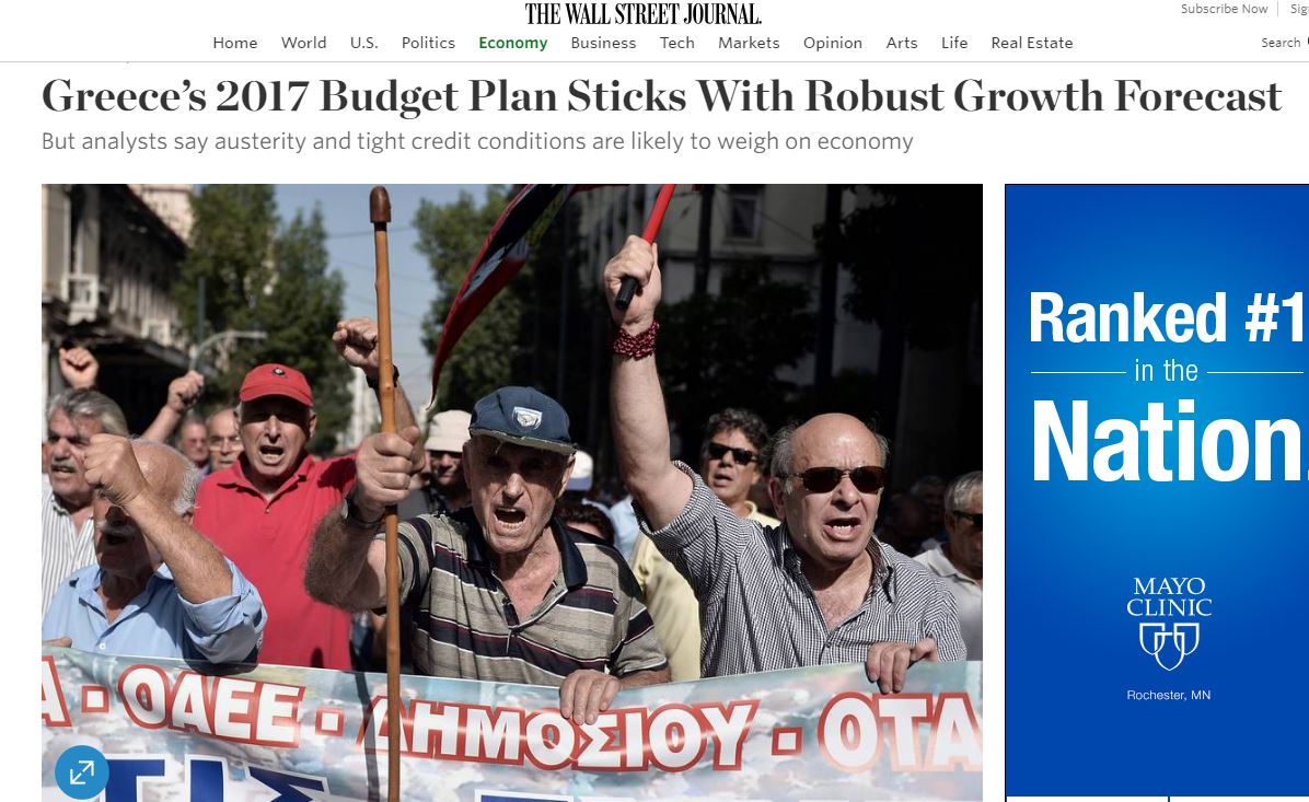 WSJ: Υπερβολικά αισιόδοξος ο προϋπολογισμός της Ελλάδας για το 2017