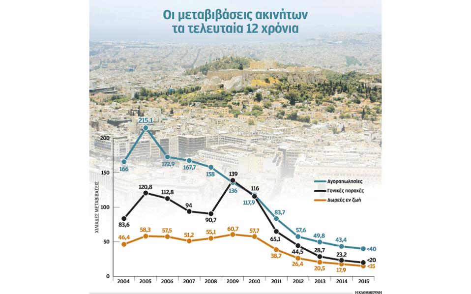 Υπό αυτά τα δεδομένα, οι γονικές παροχές από 139.000 που είχαν φτάσει σε ετήσια βάση το 2009, έφτασαν το 2015 να έχουν περιοριστεί σε κάτω από 20.000. με την πτώση να ανέρχεται κοντά στο 85%. Οσο για τις δωρεές, από 60.000 το 2009, δεν ξεπερνούν σήμερα τις 15.000. με την ποσοστιαία πτώση να φτάσει στο 75%. Οσο για τις αγοραπωλησίες, έκαναν ρεκόρ το 2005 (215.000), υποχώρησαν στις 135.000 το 2009 και σήμερα είναι λιγότερες από 40.000 σε ετήσια βάση.