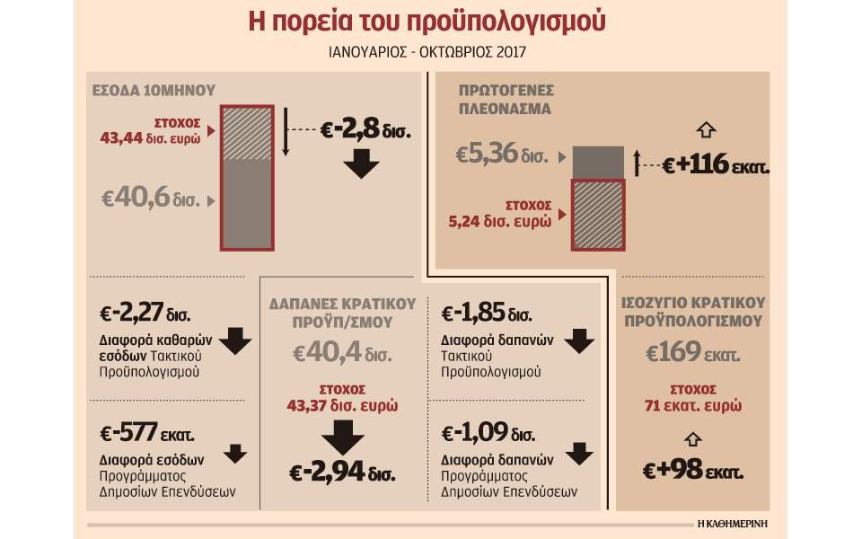 Οι δαπάνες του κρατικού προϋπολογισμού για την περίοδο Ιανουαρίου - Οκτωβρίου 2017 ανήλθαν στα 40,428 δισ. ευρώ και είναι μειωμένες κατά 2,940 δισ. ευρώ έναντι του στόχου.
