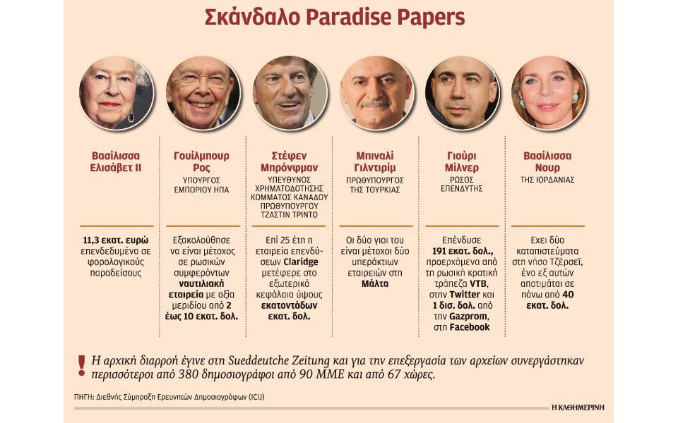 Στα 13,4 εκατ. Paradise Papers περιλαμβάνονται μέλη της βρετανικής βασιλικής οικογενείας και της αμερικανικής κυβέρνησης, τα οποία πληρώνουν αδρά τις νομικές υπηρεσίες της εταιρείας Appleby των Βερμούδων και άλλων περιοχών για να διοχετεύσουν έσοδα εκατομμυρίων σε περίπλοκες διαδρομές χρήματος, με την κάλυψη του νομικού πλαισίου της εκάστοτε χώρες ή περιφέρειας. Το πρόβλημα με τα Paradise Papers ή τα Luxileaks το 2014 είναι ότι η φοροαποφυγή είναι νόμιμη και χρειάζεται την πολιτική βούληση όλων των κυβερνήσεων του κόσμου για να κλείσουν τα παραθυράκια που επιτρέπουν την πρακτική της.