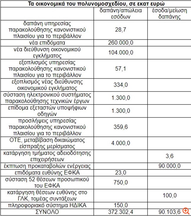 Ο λόγος για τις διατάξεις για τις οποίες το Γενικό Λογιστήριο έχει υπολογίσει την δημοσιονομική τους επίπτωση στην Ειδική Έκθεση που συνοδεύει το νομοσχέδιο στη Βουλή και αφορούν μεταξύ άλλων δαπάνες για μια σειρά από νέες υπηρεσίες που δημιουργούνται ή στελεχώνονται με βασική την νέα διεύθυνση οικονομικού εγκλήματος (104 εκατ. ευρώ το κόστος) αλλά και παρακολούθησης του κανονιστικού πλαισίου για το περιβάλλον, του συστήματος παρακολούθησης τεχνικών έργων, του ΗΔΙΚΑ και της στελέχωσης/μεταφοράς αρμοδιοτήτων στον ΕΦΚΑ. Απώλεια προκαλεί και η μεταβίβαση του δικαιώματος είσπραξης μερίσματος από τον ΟΤΕ  και βέβαια τα νέα οικογενειακά επιδόματα (260 εκατ ευρώ).