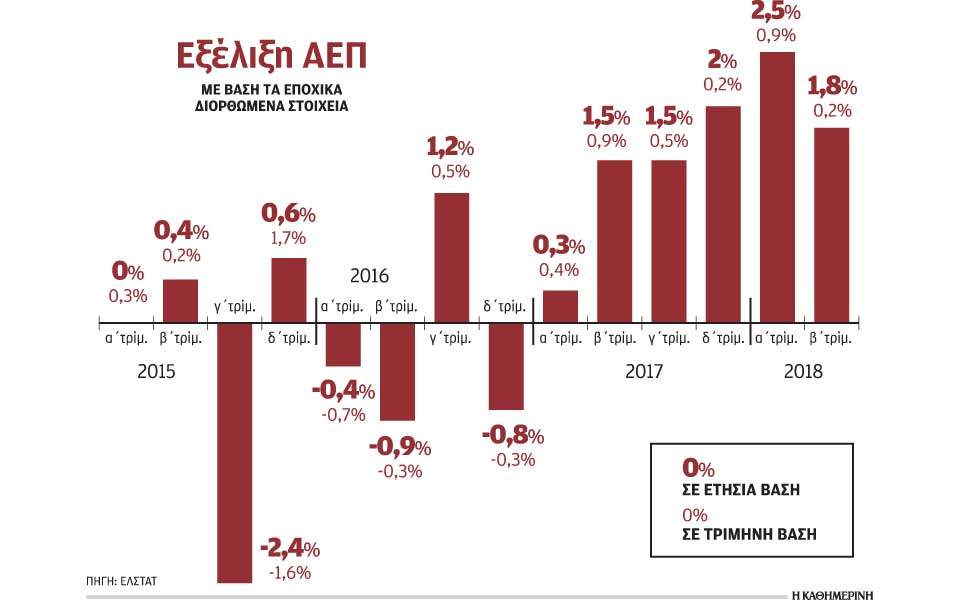 Ετσι, κατά μέσον όρο ο ρυθμός ανάπτυξης του α΄ εξαμήνου διαμορφώθηκε στο 2,1%. Δεδομένου ότι ο στόχος για το 2018 είναι 2%, θα απαιτηθεί ένας μέσος ρυθμός 1,9% το β΄ εξάμηνο για να επιτευχθεί.
