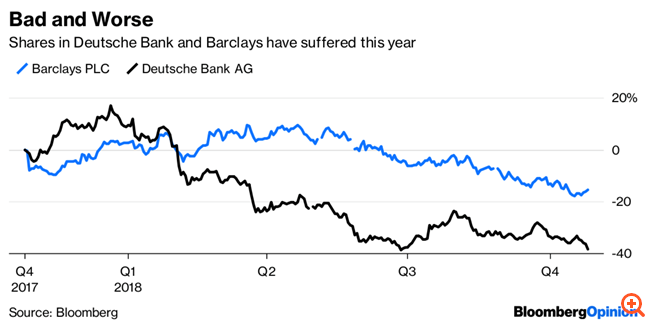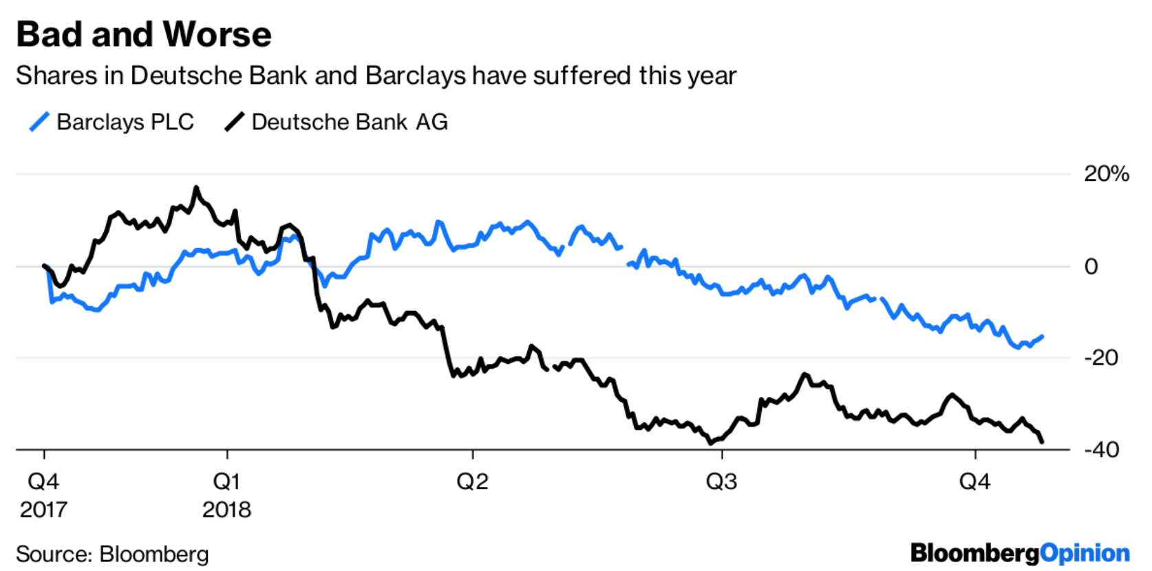 Τα έσοδα από διαπραγμάτευση της Deutsche στο γ΄ τρίμηνο ήταν θλιβερά και τα καθαρά κέρδη της βυθίστηκαν κατά τα δύο τρίτα. Η επενδυτική τράπεζα της Barclays τα πήγε καλύτερα αλλά και πάλι, κατέγραψε τα χαμηλότερα έσοδα τριμήνου σε δύο χρόνια. Από τις δύο, η Deutsche Bank έχει πιο βαθιά προβλήματα. Οι μετοχές της σημείωσαν πτώση 4%, ενώ αυτές της Barclays εμφάνισαν μικρή άνοδο. Αλλά οι επενδυτές και των δύο τραπεζών δεν βλέπουν αρκετά στοιχεία που να τους ικανοποιούν.