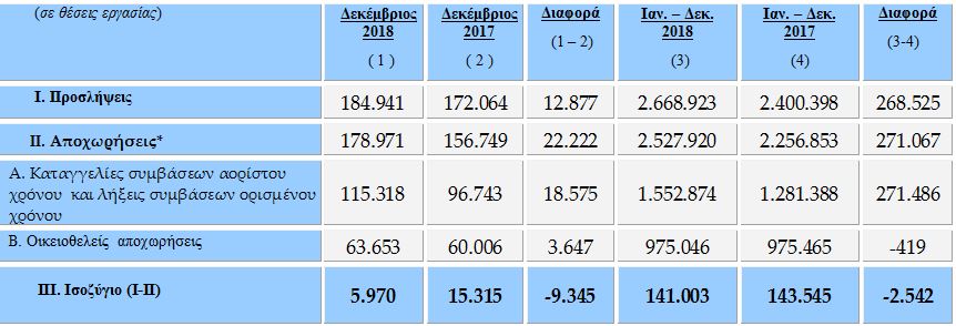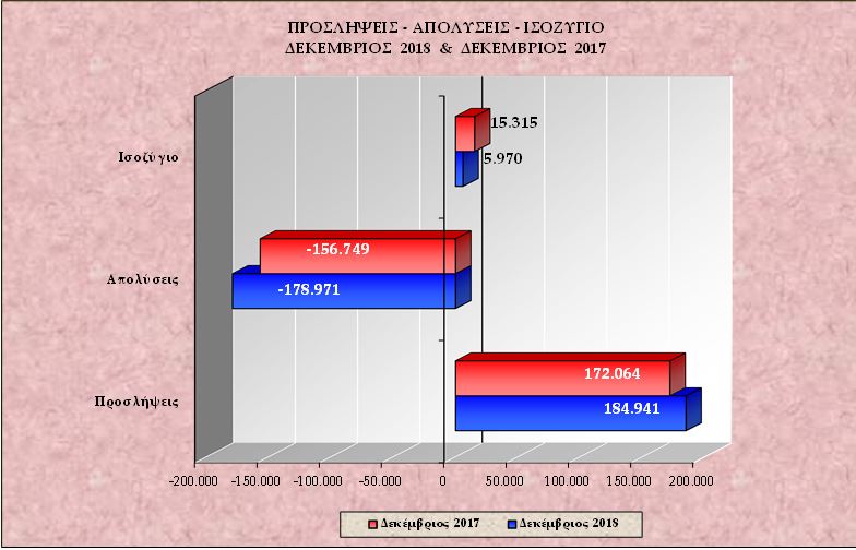 Συγκεκριμένα, σύμφωνα με τα στοιχεία των ροών μισθωτής απασχόλησης του Δεκεμβρίου 2018, οι αναγγελίες πρόσληψης ανήλθαν σε 184.941 και οι αποχωρήσεις σε 178.971.