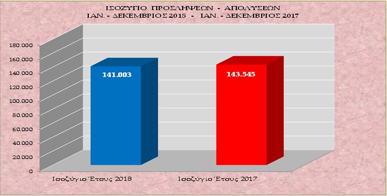 Το ισοζύγιο προσλήψεων – αποχωρήσεων είναι θετικό κατά 141.003 θέσεις εργασίας στο δωδεκάμηνο του 2018 και η επίδοση αυτή αποτελεί τη δεύτερη υψηλότερη επίδοση έτους από το 2001 έως σήμερα, μετά την επίδοση του 2017.