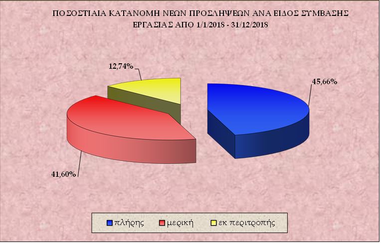 Από τις νέες θέσεις εργασίας που δημιουργήθηκαν το 54,34% ανήκουν στις ευέλικτες μορφές απασχόλησης και το 45,66% αφορούν θέσεις πλήρους απασχόλησης.