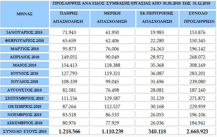 Αθροιστικά για την περίοδο Ιανουάριος – Δεκέμβριος 2018, οι αναγγελίες προσλήψεων ανήλθαν στις 2.668.923 και οι αποχωρήσεις έφτασαν τις 2.527.920, εκ των οποίων οι 1.552.874 ήταν αποτέλεσμα καταγγελιών συμβάσεων αορίστου χρόνου ή λήξεων συμβάσεων ορισμένου χρόνου και οι 975.046 οικειοθελείς αποχωρήσεις.