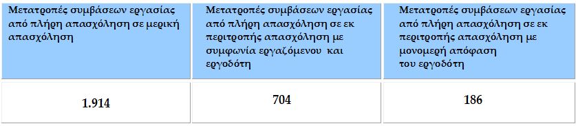 Ενδιαφέροντα συμπεράσματα δε για το τι ακριβώς συμβαίνει στην αγορά εργασίας προκύπτουν και από τον παρακάτω πίνακα που καταγράφει τις συμβάσεις πλήρους απασχόλησης, που μετατράπηκαν σε μερική και σε εκ περιτροπής απασχόληση (κατόπιν συμφωνίας εργαζόμενου – εργοδότη ή μονομερούς απόφασης του εργοδότη), κατά το μήνα Δεκέμβριο 2018.