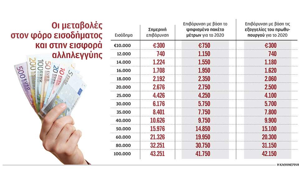 1. Φόρος εισοδήματος: Για τη μεγάλη πλειονότητα των φορολογουμένων με ατομικό εισόδημα έως και 12.000 ευρώ δεν θα υπάρξει καμία αλλαγή στο εκκαθαριστικό ούτε του 2019 ούτε του 2020. Ακόμη όμως και για τους έχοντες ατομικό εισόδημα της τάξεως των 14.000 έως 20.000 ευρώ, το μηνιαίο εισόδημα θα αυξηθεί από 3,5 έως 14 ευρώ και αυτό από το 2020 λόγω της μείωσης της εισφοράς αλληλεγγύης. Για το σύνολο των ελεύθερων επαγγελματιών και των αυτοαπασχολουμένων, αλλά και για τους μισθωτούς με ατομικό εισόδημα άνω των 35.000 ευρώ, το νέο πακέτο Τσίπρα για τον φόρο εισοδήματος είναι χειρότερο από αυτό που έχει ήδη ψηφιστεί για το 2020 και το οποίο περιλαμβάνει τη μείωση του αφορολογήτου, τη μείωση του βασικού συντελεστή της κλίμακας αλλά και την ευνοϊκότερη κλίμακα υπολογισμού της εισφοράς αλληλεγγύης.