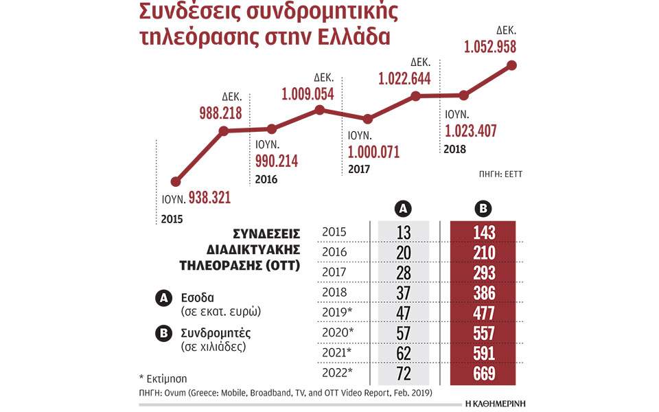 Τα στοιχεία για την αγορά της τηλεόρασης μέσω Διαδικτύου δείχνουν μια πολύ μεγάλη ανάπτυξη τα τελευταία χρόνια. Η Ovum αναφέρει ότι από 144.000 συνδρομητές στο τέλος το 2015, στο τέλος του 2018 ανήλθαν σε 385.000 και μέχρι το 2022 θα ανέλθουν σε 670.000. Η συγκεκριμένη αγορά, από 13 εκατ. ευρώ που ήταν το 2015, θα ξεπεράσει τα 70 εκατ. ευρώ το 2020. Παράγοντες εκτιμούν ότι η συγκεκριμένη αγορά μπορεί να είναι ακόμη μεγαλύτερη. Παρακολουθώντας την κίνηση του δικτύου της Netflix, θεωρούν ότι μπορεί να υπάρχουν πάνω από 600.000 συνδρομητές των υπηρεσιών Νetflix στην Ελλάδα. Ωστόσο, τα στοιχεία αυτά δεν επιβεβαιώνονται και αποτελούν κυρίως εικασίες, καθώς η αμερικανική επιχείρηση δεν διαθέτει στοιχεία για την Ελλάδα. Το μόνο δεδομένο είναι ότι η παραδοσιακή αγορά συνδρομητικής τηλεόρασης από το 2015 και μετά παραμένει σχεδόν «παγωμένη». Σύμφωνα με τα στοιχεία της Εθνικής Επιτροπής Τηλεπικοινωνιών και Ταχυδρομείων (ΕΕΤΤ), οι συνδέσεις (συνδρομές) συνδρομητικής τηλεόρασης, από 988.000 που ήταν στο τέλος του 2015, στο τέλος του 2018 ανήλθαν σε 1,05 εκατ., σημειώνοντας αύξηση 6,5%.