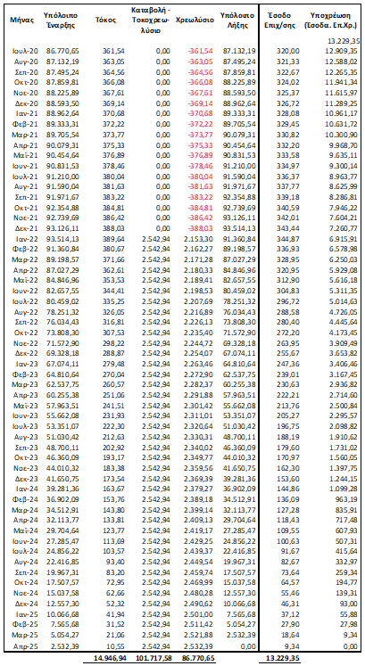 Ακολουθεί ο πίνακας του κρατικού δανείου στο ονομαστικό ποσό, καθώς και η σταδιακή τοκοχρεολυτική εξόφλησή του: